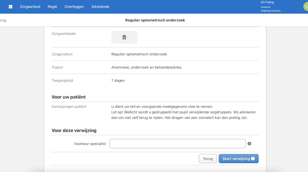 Met Eyehelp kunnen optometristen eenvoudig diagnosticeren, raadplegen en doorverwijzen. De optometristen ontvangt de verwijzing van de huisarts. De digitale verwijzing en patiëntinformatie zijn direct beschikbaar in Eyehelp. Via het Eyehelp platform wordt een diagnose gesteld, patient gegevens toegevoegd en oog beelden geüpload. Indien nodig kunnen optometristen een Eyehelp-arts consulteren en krijgen ze binnen vier uur antwoord. In acute gevallen verwijzen optometristen rechtstreeks naar een oogarts, eventueel in overleg met de huisarts.